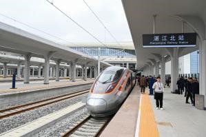 【中新社廣東湛江12月22日電】(梁盛 謝劍鋒)設計行車時速350公里的廣湛高鐵22日建成通車,廣州、湛江兩地互達約90分鐘,較以往通行時間縮短約1小時。