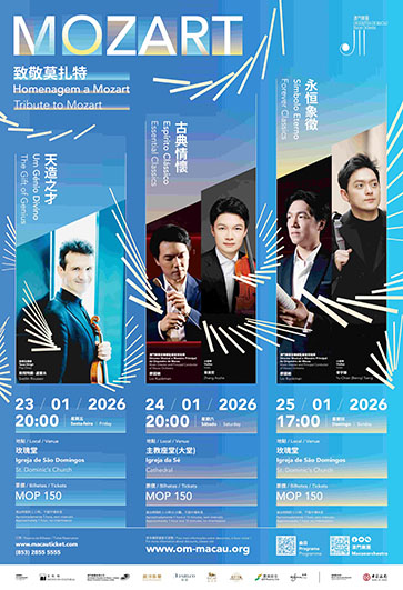【特訊】澳門樂團2025-26樂季之“致敬莫扎特”系列音樂會,將於2026年1月23日至25日在玫瑰堂及主教座堂舉行,分別由3位國際知名小提琴家演繹莫扎特早期至藝術巔峰時期的經典作品,引領樂迷跨時空感受“音樂神童”作品的生命力與美感。音樂會設演前導賞、大師班及交流見面會等延伸活動,讓樂迷近距離與藝術家互動交流。