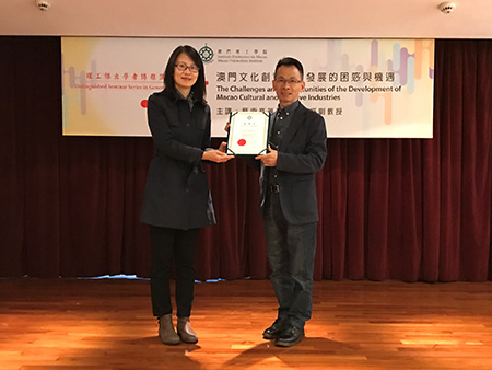 講座由鍾渠盛副教授主講,內容主要圍繞文化創意產業的歷史、近世文創產業的發展趨勢及電腦網絡/高科技產品對文創的影響。講座上,鍾渠盛副教授分析了澳門文創發展的機遇及挑戰。鍾渠盛介紹,澳門被列入聯合國世界文化遺產歷史城區,擁有四百多年互相交流、多元共存的歷史、澳葡特色文化資源豐富,配合國家“一帶一路”葡語系國家平台商機等的優勢和機遇來發展文創產業。鍾渠盛同時分析,澳門當前正面對著專業人才、國際文創開發經驗、市場意識、土地空間及市民認知與投入度方面等的挑戰。