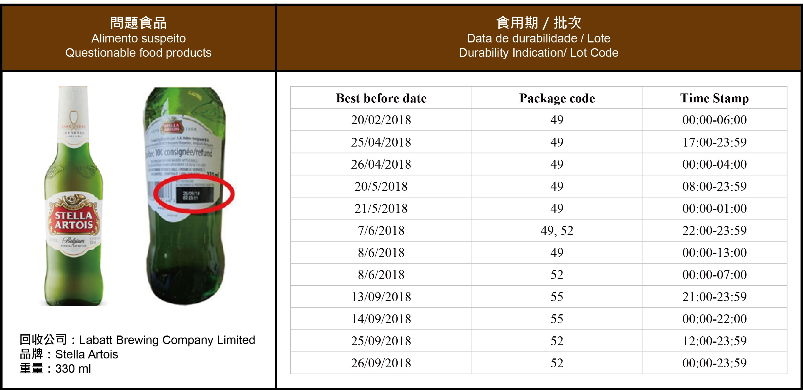 民署食安中心透過恆常食品事故監察系統,獲悉Labatt Brewing Company Limited回收可能含有玻璃碎片的啤酒產品。涉及回收的產品名稱“Stella Artois”,容量330毫升。根據現階段資料,涉事產品共有十二批次,包括: