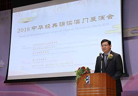 【特訊】由國家教育部語言文字應用管理司與港澳台事務辦公室及教育暨青年局主辦,澳門中華教育會協辦,南京藝術學院、南京農業大學及西北師範大學承辦的“2018中華經典誦讀澳門展演會”於昨(17)日下午3時假鏡平學校(小學部)禮堂順利舉行。國家教育部語言文字應用管理司巡視員婁晶、教青局局長老柏生、中央人民政府駐澳門特別行政區聯絡辦公室教育與青年工作部部長徐婷、教青局副局長梁慧琪及龔志明、澳門中華教育會會長何少金、澳門天主教學校聯會會長周伯輝及理事長黃彪、澳門公職教育協會會員大會主席鄭衛星,以及澳門各中小學學校負責人和約5百名師生出席了展演會。