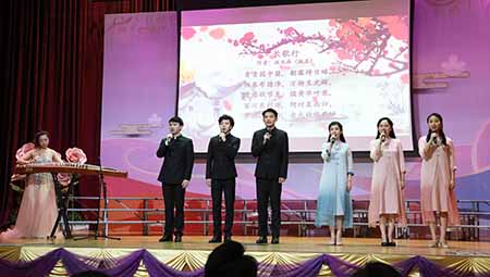 展演會由南京藝術學院、南京農業大學及西北師範大學師生攜手演出,通過朗誦、配音、繞口令等形式,結合歌舞、古箏、書法等元素,呈獻了精彩的表演,展現了中華經典嶲永的風采;化地瑪聖母女子學校亦派出中學生表演集體朗誦,共揚經典之聲。在繞口令模仿的互動環節中,兩地學生的普通話互動意趣橫生,帶來熱烈的歡呼及讚嘆。書法表演環節,古箏伴奏,舞蹈相配,洋溢詩意。作品完成後,表演學生將作品送贈老柏生,並與在座師生共勉,實踐自強不息,厚德載物的精神。兩地學生的精彩演出,贏得全場師生的陣陣掌聲,活動在歡快的氣氛中圓滿結束。