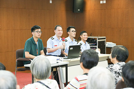 出席宣傳講解會的人員有本校陳國棠副消防總長、黃仲勝副一等消防區長、麥健強副一等消防區長以及社會工作局關志文技術員。