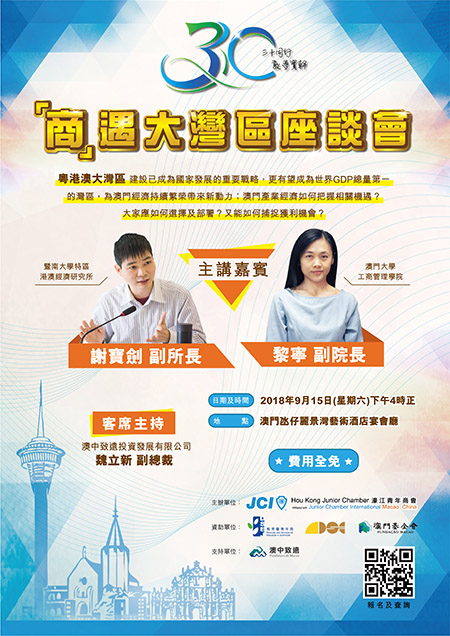 是次座談會邀請了澳門大學工商管理學院副院長黎寧教授和暨南大學特區港澳經濟研究所謝寶劍副所長,以粵港澳大灣區為題材,探討港澳應如何透過大灣區之建設去融入國家發展大局,提供戰略支撐和重要平台。從年青人的角度去探討應如何選擇及部署粵港澳大灣區的發展所帶來的機遇。緊接於晚上七時正將舉辦濠江青年商會成立三十周年慶祝晚宴,歡迎各界青年朋友踴躍參與。活動報名及查詢請致電:6222 8816陳小姐或6688 6244陳先生。
