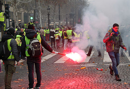 警方不斷向示威人群投射催淚瓦斯,試圖阻止示威者繼續從香榭麗舍大街向政府部門進發。催淚瓦斯的爆炸聲在香榭麗舍大街此起彼伏,空氣中彌漫著強烈的催淚瓦斯氣味。大批示威者在催淚瓦斯的煙霧中不得不後退。
