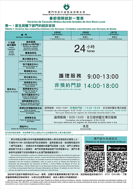 【特訊】本年2月5日至7日(農曆年初一、初二、初三)是春節假期,政府部門休息,為便有需要人士就診,衛生局將維持相關醫療服務,為此作出如下就診安排: