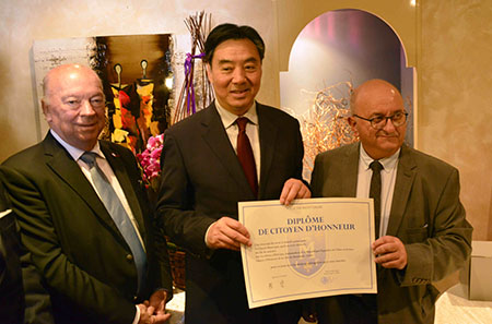 【中新社巴黎6月15日電】(記者 李洋)中國駐法大使翟隽當地時間15日被授予蒙達爾紀市“榮譽市民”稱號。蒙達爾紀市長迪容主持儀式,為翟隽頒發榮譽市民證書。