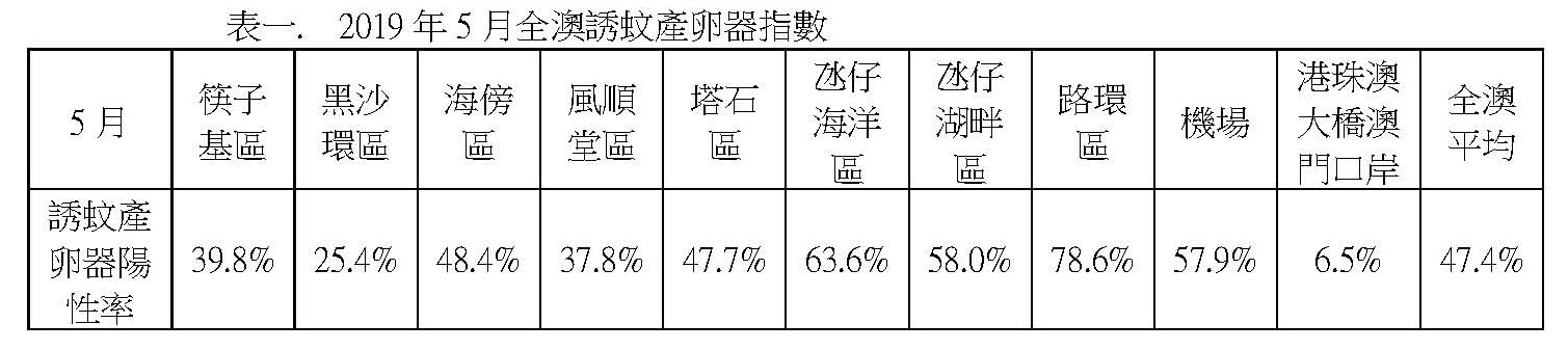 為掌握白紋伊蚊的戶外孳生活動及分佈情況,衛生局自2002年起常規放置誘蚊產卵器進行監測,現時全澳共有約890個誘蚊產卵器,衛生局每月會收集誘蚊產卵器統計陽性率並計算指數。根據2019年5月的誘蚊產卵器指數,全澳平均的誘蚊產卵器指數為47.4%,指數較4月份的34.3%進一步上升,但和自2002年起同期的平均數值(49.9%)相若,在澳門半島以海傍區及塔石區最高,分別為48.4%及47.7%,在離島則以路環區最高,為78.6%(見下表)。