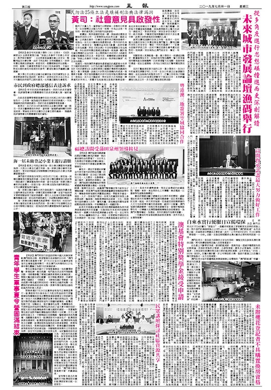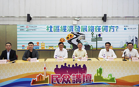昨午「民眾講壇」在民建聯綜合活動服務中心舉行,探討社區經濟發展方向,包括目前社區營商情況、旅客與居民「資源共享」等問題。社會綜合研究學會會長葛萬金、北區社諮委蔡思偉、中區社諮委歐陽廣球、離島社諮委吳鴻祺、民眾建澳聯盟理事長李良汪等出席。