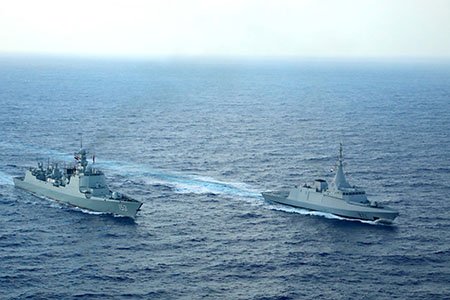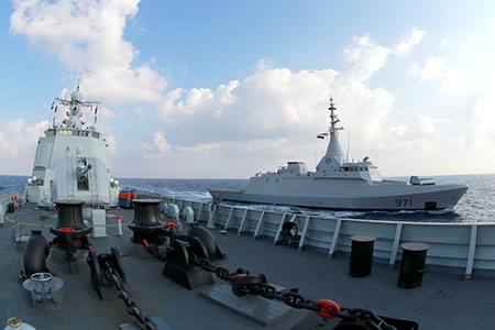 隨後,雙方還進行了隊形變換結合燈光通信、直升機著艦、特戰隊員索降、臨檢拿捕以及海上航行補給等內容的演練。18時許,聯合演練結束後,西安艦與“阿拉法特”號護衛艦分航告別。