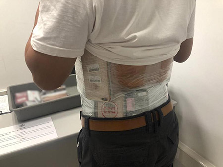本月27日晚上,港珠澳大橋澳門口岸關員截查一名使用綠色通道(無需申報通道)過關的旅客,首先透過X光機發現其背包內藏有42部舊智能電話,隨後,關員再以亳米波人體安檢系統對該名旅客作非接觸式體表檢查,從影像中發現其腰、腿間綁纏一批金屬物,經進一步檢查,證實該批金屬物為60部舊智能電話。