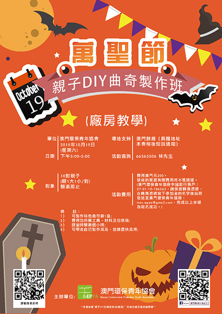 【特訊】澳門環保青年協會將於10月19日(星期六)在澳門曲奇餅廠舉辦「萬聖節 - 親子 DIY 曲奇製作班」,本次親子活動面向家庭,既可以鍛煉小朋友動手能力和注意力,又可以促進親子間關係,還可以了解下澳門造餅廠房的歷史,寄學習於娛樂,何樂而不為?快點拿起手機報名吧!網址:https://reurl.cc/oDgxrM