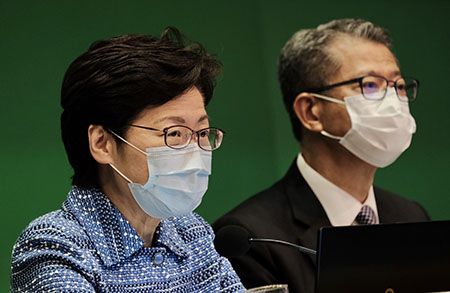 當日傍晚,林鄭月娥聯同特區政府政務司司長張建宗、財政司司長陳茂波、勞工及福利局局長羅致光等政府官員舉行記者會,並亮出“同心抗疫、共渡時艱”的背景屏幕。