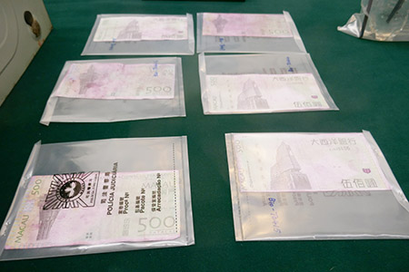 【特訊】司警偵破一宗偽造貨幣及吸毒案,拘捕三名本澳無業男女,檢獲六張分別相同號碼及没有號碼的偽造五百元澳門元假鈔,案件已移交檢察院偵辦。