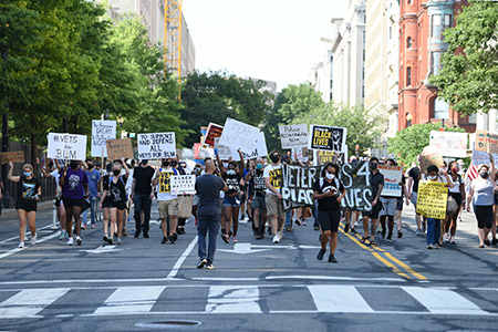 相比在國家廣場候場的稀疏人群,在華盛頓街道上抗議的遊行隊伍反而顯得更加齊整。當天,在白宮、國會山等處,均出現小規模的反種族歧視示威。這場因非裔男子喬治·弗洛伊德之死引發的抗議活動,在近來掀起一場清除涉種族主義歷史雕像與紀念標識的運動。