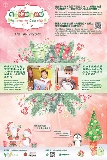 【特訊】由市政署及澳門明愛合辦的“聖誕送暖童歡樂2020”活動將於十一月十四日至十二月三十一日舉行,歡迎市民大眾踴躍參與,透過認購禮物及籌款項目,為本澳有需要的兒童和青少年送上節日祝福與關愛。