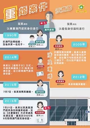案情指,涉案的吳姓男子早於一九九零年與一名周姓女子,在本澳註冊結婚並育有一名兒子。兩年後,吳姓男子在內地認識涉案的鍾女,兩人發展成情侶關係,至二零零五年鍾女懷孕。吳姓男子為了負責任,懷疑用二千元在內地找人用假資料,成功獲得一個內地戶藉,之後隱瞞當時妻子周女,用假身份於內地結婚。
