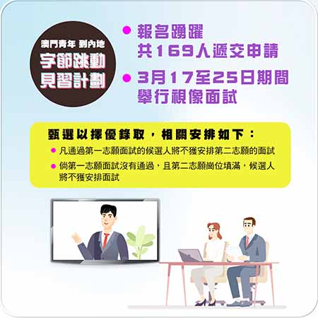 【特訊】勞工局與內地著名企業北京字節跳動科技有限公司合作推出“澳門青年到內地字節跳動見習計劃”(下稱“字節跳動”),報名期已於2月28日結束,合共有169人遞交申請,整體報名情況踴躍。