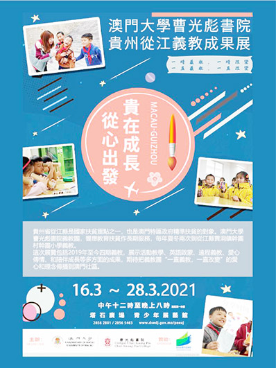 【特訊】由澳門大學曹光彪書院主辦、教育及青年發展局贊助的“‘貴’在成長、‘從’心出發—貴州從江義教成果展”,將於2021年3月16至28日於教育及青年發展局轄下的青少年展藝館舉行。歡迎有興趣市民參觀。