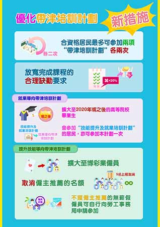 “提升技能導向帶津培訓計劃”由僱主安排其僱員在正常工作時間內參加培訓計劃,由推薦計劃至完成培訓課程期間,沒有降低相關僱員的基本報酬,亦沒有與其協商安排無薪假,按每一名完成培訓並參加考核的僱員計算,僱主可獲發放5,000澳門元的培訓津貼;如僱主推薦原已處於無薪假的僱員參加培訓計劃,或對處於無薪假狀況經與僱主溝通但不獲僱主推薦而自行申請報讀僱員,以及自由職業者本人參加培訓計劃,則有關僱員或自由職業者於完成培訓及參加課程考核後,可獲發最高5,000澳門元的培訓津貼,有關計劃將於6月7日至11日接受報名。