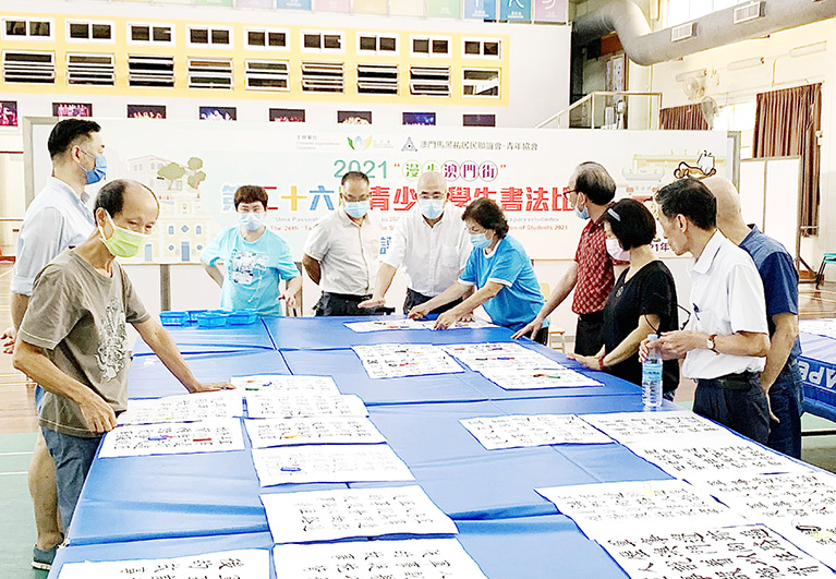 【特訊】《二零二一「漫步澳門街」第二十六屆青少年學生書法比賽》日前在澳門坊眾學校(中學部)舉行評審,揭曉五個組別作品名次。而入選獎名單將於本月三十日在市政署公民教育資訊網、澳門街坊會聯合總會網頁、公民教育樂之家Facebook及澳門馬黑祐青年協會Facebook公佈。