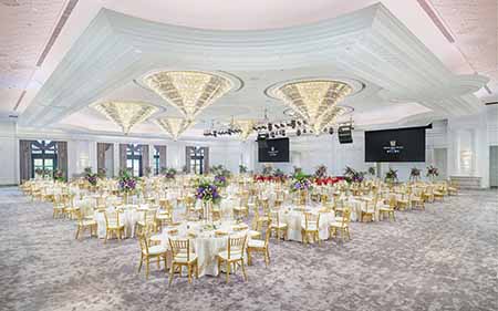 完美絕倫的活動場地—上葡京的室內外活動場地總面積逾3,800平方米,設計瑰麗典雅,適合舉辦各式婚宴、會議及其他活動。無柱式宴會廳「上葡京禮堂」面積達1,400平方米,內置光雕投影設備,能夠迎合各種婚慶主題,可舉辦多達780人的圓桌宴會,或招待1,500人的雞尾酒會。上葡京的壯麗 建 築 環繞著 宴會廳相連的戶外活動場地「綠茵勝境」花園,富麗堂皇的景色使每場活動大放異彩,讓賓客留下難忘回憶。