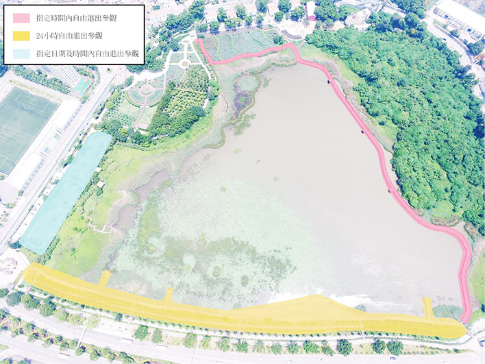 生態步道分東北側段及南段,東北側段開放時間為每日上午6時至下午6時;南段生態步道則全天候開放。除生態步道外,市民及遊客亦可參觀西側一帶的生態池,開放時間為逢星期六、日、公眾假期及補假日的上午9時至下午5時。為方便遊覽及認識濕地的生物多樣性,區內設有生物資料解說牌,簡單介紹鳥類、昆蟲、水生植物等的基本資訊。同時,解說牌附有二維碼,遊人可掃瞄相關二維碼,進入澳門生物資料庫詳細了解該物種的資訊。