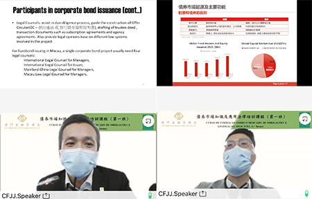 是次課程邀請到來自內地、本地、香港及葡萄牙的導師,結合網上及面授形式授課,內容涵蓋債券市場及債券交易、各地債券市場的發展概況,以及相關法律實務應用等。