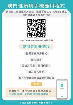 應變協調中心呼籲居民盡快下載「澳門健康碼」手機應用程式,因其較網頁版更穩定及方便使用,居民下載手機應用程式後,進入場所時掃瞄場所二維碼,掃瞄記錄會存於居民的手機程式28天,超過28天記錄會在手機後台自動刪除。當出現確診者時,經確診者同意後,可協助自行上傳程式內的場所掃描記錄到衛生局後台系統,後台系統可把確診者到過的場所設定成風險場所,系統只會在使用者自願的情況下才能上傳自己的行程記錄。居民可掃瞄二維碼或輸入網址:https://www.ssm.gov.mo/healthPHD,參閱「澳門健康碼」圖文包,了解如何下載及操作「澳門健康碼」。