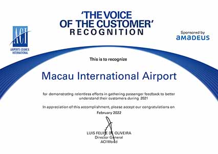 澳門國際機場獲得國際機場協會表彰為「The Voice of the Customer」(客戶之聲),肯定了機場及其團隊的持續努力優化旅客服務。澳門國際機場將繼續努力不懈滿足旅客的需求,在兼顧防疫的同時逐步提升旅客體驗。