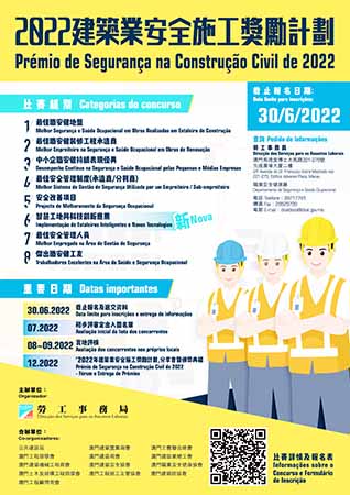 2022年「建築業安全施工獎勵計劃」分為八個組別進行比賽,分別為1.最佳職安健地盤、2.最佳職安健裝修工程承造商、3.中小企職安健持續表現優異、4.最佳安全管理制度(承造商/分判商)、5.安全改善項目、6.智慧工地與科技創新應用、7.最佳安全管理人員及8.傑出職安健工友。報名日期由即日起至6月30日止,凡澳門註冊承造商和分判商,以及地盤安全管理人員和工友,均可報名參加是次比賽。每個組別均設有金、銀、銅獎,而最佳職安健地盤和最佳職安健裝修工程承造商組別的各分組最高分數得獎者更可獲頒發組別大獎。得獎者除可獲得獎項外,獲獎名單將會送交有關公共部門作參考記錄,各獎項得獎公司更可獲勞工事務局引薦成為「職業安全健康約章」成員,以鼓勵和嘉許其在職安健的良好表現,藉此提升公司安全管理形象。