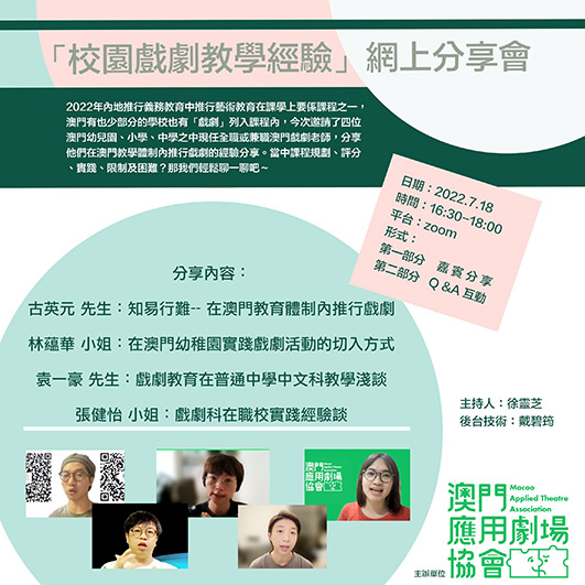 有見及此,澳門應用劇場協會特別舉行了「校園戲劇教學經驗」線上分享會,由該協會創辦人、澳門大老鼠兒童戲劇團團長徐靈芝小姐擔任主持人,邀請了古英元先生(戲劇導演碩士、小學全職戲劇教育)、林藴華小姐(戲劇與劇場教育碩士、教育心理碩士、學前教育學士、幼稚園兼職戲劇教師)、袁一豪先生(戲曲-京劇表演學士、中學兼職教師)及張健怡小姐(戲劇導演學士、職業技術學校兼職戲劇科教師),分別就「知易行難——在澳門教育體制內推行戲劇」、「在澳門幼稚園實踐戲劇活動的切入方式」、「戲劇教育在普通中學中文科教學淺談」及「戲劇科在職校實踐經驗談」進行分享,介紹了在澳門職校、中小學及幼稚園內,推行戲劇學科及跨學科教育戲劇執行的實際情況,分享在戲劇教學時所面對的難題和解決辦法,以及學生在學習戲劇領域知識時上到的問題,同時也提出了對戲劇教學的獨特見解和教學反思。