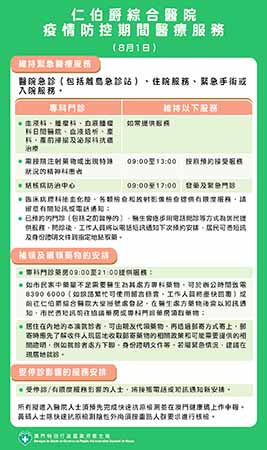 一、仁伯爵綜合醫院:1.緊急醫療需要:醫院急診(包括離島急診站)維持正常服務。住院服務、緊急手術或入院服務維持正常。