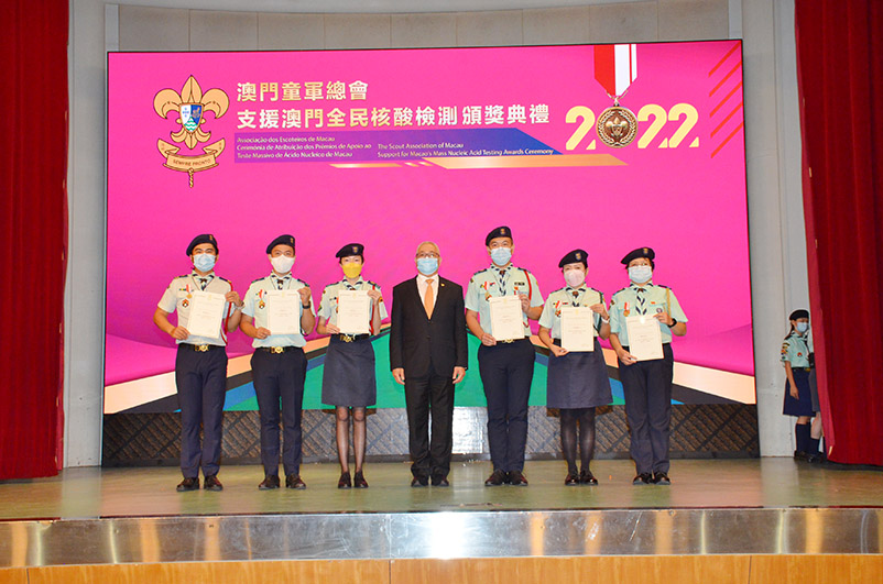 【特訊】澳門童軍總會昨(九月十八日)假濠江中學何賢紀念堂舉辦「澳門童軍總會支援澳門全民核酸檢測頒獎典禮」,向一眾童軍頒發特別任務紀念獎章、感謝狀及紀念布章,對所有參與澳門全民核酸檢測支援工作的童軍人士,給予高度的肯定和表揚,共一百一十六位童軍人士獲嘉許。