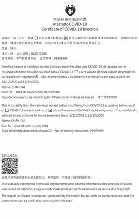 【特訊】新型冠狀病毒感染應變協調中心表示,在疫情防控過渡期期間,會在短時間內出現大量新型冠狀病毒感染者(以下簡稱“感染者”),絕大部分感染者可自行在家治療而痊癒。為免感染者僅因需要取得醫生證明而就診,造成醫療服務擠兌,影響真正有就診需要人士的醫療服務,衛生局昨日(13)日作出第631/A/SS/2022號公告,向感染者以自動化及電子化方式發出“新冠病毒感染證明書”。在具體程序上,感染者可透過衛生局設立的“新冠病毒感染者評估及社區門診預約系統”作出申報,系統會自動記錄,並發出短訊,短訊內有下載“新冠病毒感染證明書”連結,登入後可自行下載,當中載明居家治療的開始和結束日期,期間為由首次證實新冠病毒核酸或抗原檢測陽性起計5天。“新冠病毒感染證明書”上載有二維碼,掃描二維碼後可連結到衛生局網站顯示該證明書內容以判斷真偽;若感染者在第6天上午抗原檢測結果仍為陽性,可再上載抗原檢測結果及在網站上作出申報,以再取得2天居家治療的“新冠病毒感染者證明書”。