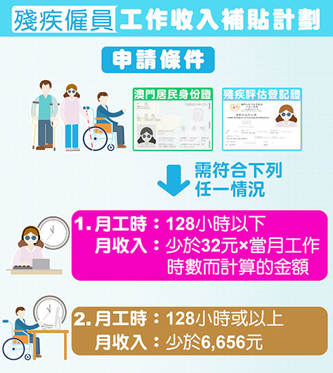 凡持有由社會工作局發出有效的殘疾評估登記證的本地僱員,如按月累計工作總時數少於128小時,且當月工作收入少於《僱員的最低工資》規定的每小時最低工資金額32澳門元乘以當月實際提供工作時數而計算的金額;又或符合按月累計工作總時數等於或多於128小時,且當月工作收入少於《僱員的最低工資》規定的每月最低工資金額6,656澳門元,均可作出申請。