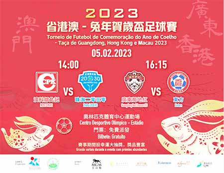 【特訊】為與市民喜迎癸卯兔年,歡度新春佳節,由體育局與澳門足球總會合辦的“2023省港澳-兔年賀歲盃足球賽”將於本年2月5日在奧林匹克體育中心運動場舉行,賽事當天下午2時率先由澳科鄒北記對珠海2030,緊接4時15分由廣東蜀地紅對東方。