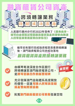 為促進及推動澳門現代金融業的發展,金管局與內地相關部委持續跟進溝通爭取支持。2022年4月,人民銀行廣州分行發佈《廣東南沙、橫琴自由貿易試驗區融資租賃資產跨境雙向轉讓人民幣結算業務展業自律指引》,允許廣東南沙和橫琴自貿區內銀行,與包括澳門在內的境外機構,跨境雙向轉讓融資租賃資產,並以人民幣進行跨境結算,助力擴大澳門融資租賃業務的規模。