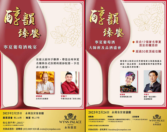【特訊】「醇韻臻饗」寧夏葡萄酒盛宴將於2月24至25日在永利皇宮舉行,當中包括兩場由知名葡萄酒大師趙鳳儀及李德美主導的葡萄酒大師班、寧夏葡萄酒品酒盛會以及由中國 烹飪大師雲鵬宇與永利皇宮永利宮行政總廚譚國鋒攜手打造的四手聯彈晚宴。是次活動永利將把中國最著名及備受國內外業界廣泛認可的寧夏葡萄酒帶到澳門,為餐飲業界提供合作交流平台同時助力宣傳華夏飲食文化。永利期望透過積極舉辦餐飲盛事推動業界發展,助力推廣澳門「創意城市美食之都」的美譽。
