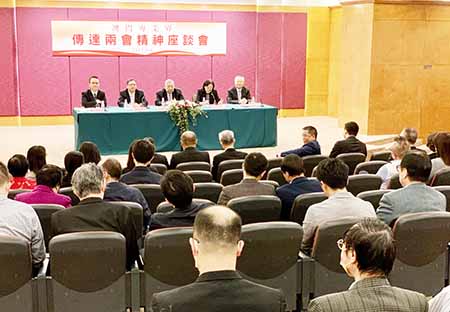 澳門專業界傳達兩會精神座談會昨日舉行,邀請澳區全國人大代表容永恩、蕭志偉、全國政協常委崔世昌、全國政協澳區委員邱庭彪、莫志偉分享兩會內容,領悟兩會精神,約五十多人出席。