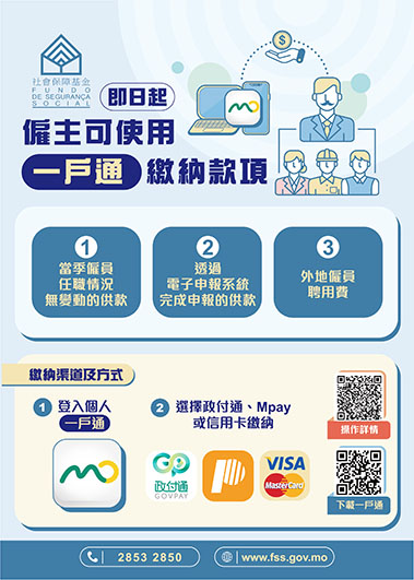 已開通電子申報服務的僱主應注意申報期限,以便透過自動轉帳或「一戶通」等方式繳納供款及外聘費;當季僱員任職情況沒有變動而未開通電子申報服務的僱主,亦可於社保基金網上平台查詢相關季度憑單編號及應繳金額(eservice.fss.gov.mo/Employer/cpa/Index),使用指定網上銀行繳款。
