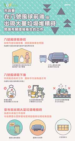 八號風球來臨前,市政署會協調澳門清潔專營有限公司檢查和加固垃圾收集設施,並提前收集垃圾。颱風過後,市政署人員會即時巡查各區環境衛生情況,而澳門清潔專營有限公司則會增派人手和車隊,加快清運垃圾。若災情嚴重,市政署會在全澳六十個地點設置臨時垃圾收集站,方便市民棄置垃圾。此外,若前線工作已超出負荷時,市政署會按照「市政署防災減災應變計劃」,調配內部人員組成救災支援梯隊,協助低窪地區的清理善後工作。