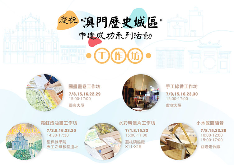 「澳門歷史城區」於2005年7月15日在第29屆聯合國教科文組織世界遺產委員會大會上獲得委員會一致通過,成功列入《世界遺產名錄》,成為我國第31處的世界遺產,意義深遠。為推動社會各界認識及共同保護澳門珍貴的文化遺產,文化局將於7月期間在鄭家大屋、盧家大屋、聖保祿學院天主之母教堂遺址、益隆炮竹廠舊址及荔枝碗船廠片區X11-X15舉辦多場以「澳門文物景點」為主題的工作坊,包括國畫畫卷工作坊、手工線香工作坊、水彩明信片工作坊、霓虹燈油畫工作坊及小木匠體驗營,活動將透過文物景點的元素融入創作,增加市民對澳門文物景點的認識和關注,引領公眾從不同角度欣賞澳門世遺之美。部分主題工作坊設有長者或親子專場,歡迎不同年齡層的市民參加。