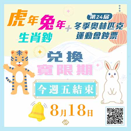 【特訊】虎年、兔年生肖鈔,及早前已發行的第24屆冬季奧林匹克運動會鈔票的兌換寬限期將於2023年8月18日(星期五)結束。澳門金融管理局呼籲,已完成網上登記但尚未辦理兌換的人士,請於寬限期屆滿前到所選定的銀行網點進行兌換。