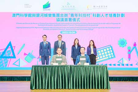 10月30日,在社會文化司司長歐陽瑜,社會文化司司長辦公室主任何鈺珊,教青局局長、澳門科學館股份有限公司股東會主席龔志明,以及銀娛副主席呂耀東的見證下,澳門科學館館長邵漢彬與銀娛董事程裕昇就“青年科技村”科創人才培養計劃簽署協議書。