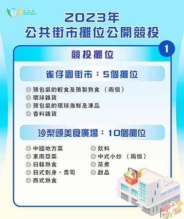 【特訊】市政署開放雀仔園街市五個攤位及沙梨頭美食廣場十個攤位作公開競投,截止投標日期為本月十六日,有意投標者須於當日下午五時前遞交申請表及競投計劃書等文件。