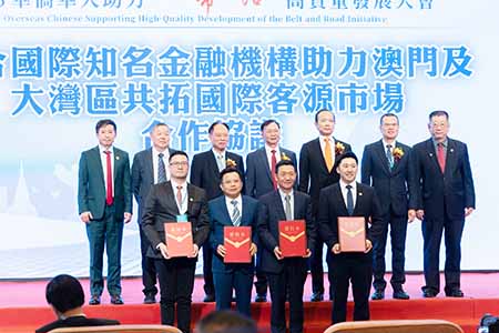 會上舉行了《聯合國際知名金融機構助力澳門及大灣區共拓國際客源市場合作協議》簽署儀式,劉雅煌、黃景城、陳冠勤、劉紅路、南方科技大學金融系主任王樹勳教授見證下,由澳航董事會主席陳洪、中國太平保險(澳門)副總經理陳日湘、英國勞合社授權機構IPH環球保險營運總監黃子龍、大灣區金融發展協會理事長陸仁山共同簽署。協議內容為通過多個社團與國際金融機構合作,共同為每位乘搭澳門航空入境的國際旅客,來澳首5天內提供1,000萬的安心旅遊健康醫療保障,承保總額高達60,000億澳門元,是全球首創大額旅遊保障計劃,未來將陸續推出“1+4”產業各類型保險產品,助力構建澳門開拓國際客源市場及推動經濟產業多元化。