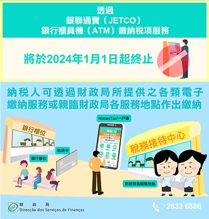【特訊】財政局近年積極推動電子政務,為有效分配行政資源,經檢視和整合各種納稅方式之後,2024年1月1日起終止透過銀聯通寶(JETCO)銀行櫃員機(ATM)繳納稅項的服務。隨著手機應用日益普及,現時納稅人可以透過移動應用程式“Macau Tax”或“一戶通”足不出戶便可線上繳納稅款,且沒有時間限制,用戶體驗更為完備,例如可即時獲取稅務訊息及收據等。