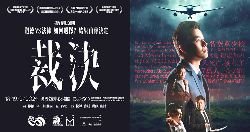 而今年的LongRun劇場系列,將帶來新鮮的「律政參與劇場《裁決》」,全場觀眾將化身陪審團,一同公投,決議案件結果。劇本是德國最受矚目的法律作家席拉赫首部力作,至今已於全球19個國家上演,累計70萬人次觀賞。故事講述一架客機被恐怖挾份子挾持,行駛向有7萬多人的足球場,而空軍少校在上級命令還未到達前,自作主張於千鈞一髮擊毀客機,拯救球場7萬人,亦讓機上乘客全數罹難,少校因此遭以謀殺罪起訴。演出從法庭的辯證開始,過程中議題不斷被擴充,立場也隨著證詞改變。空軍少校是有罪還是無罪?由走進劇院的大家一同審理。澳門版演出於2月17-20日期間上演,邀得香港Metro HoliK Studio合辦,香港最佳女主角楊螢映、香港最佳男配角蔡澤民與資深演員霍嘉珩、莫家豪共同演出。