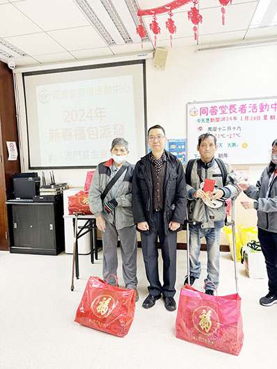 在澳門基金會的大力支持和資助下,活動於一月二十九至三十一日一連三天在同善堂長者活動中心、氹仔及路環坊眾聯誼會分別進行,該堂副主席馬有友、值理徐家頴分別向三百七十一名持該堂領物證人士及部分有困難的長者中心會員派送節日福包。受惠人士深感歡欣,表示政府能了解通脹對市民帶來的影響,適時作出紓解民困措施,使澳門市民得到實質的幫助,亦感受到政府及本堂對基層人士的關愛,增添節日的歡樂氣氛。
